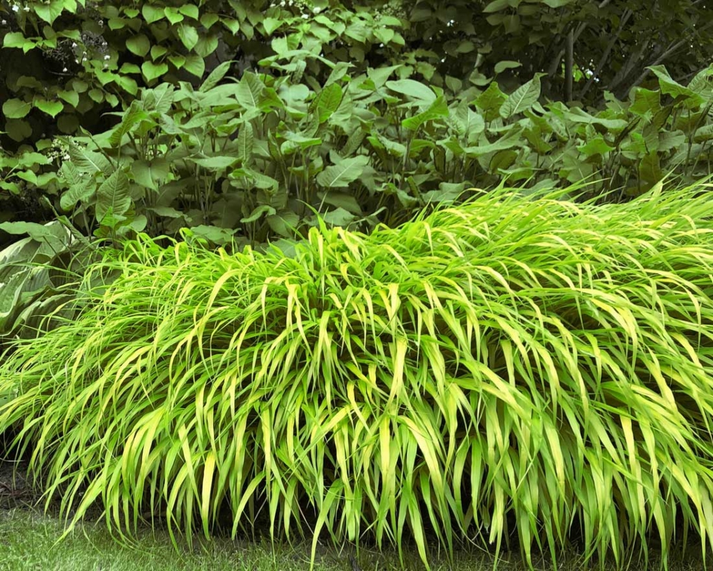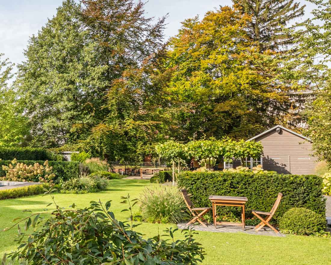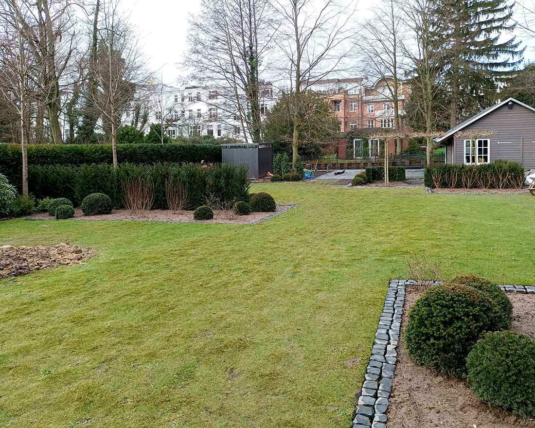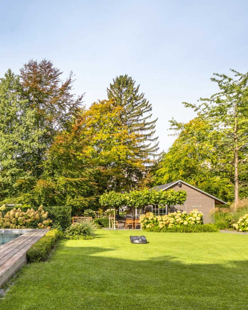Eine gepflegte Rasenfläche verbindet die einzelnen Gartenräume und sorgt für Weite und Offenheit. Die Bepflanzung folgt einem grün-weißen Farbkonzept und kombiniert immergrüne Strukturgeber mit saisonal blühenden Sträuchern und Stauden. Rispenhortensien und locker eingestreute Ziergräser schaffen ein lebendiges Pflanzbild, Hochstämme und Obstbäume sorgen für die vertikale Struktur.