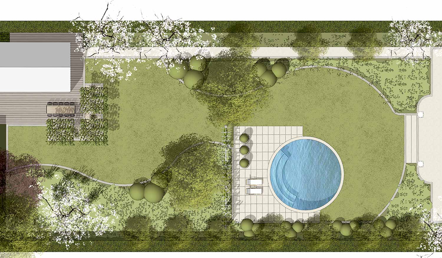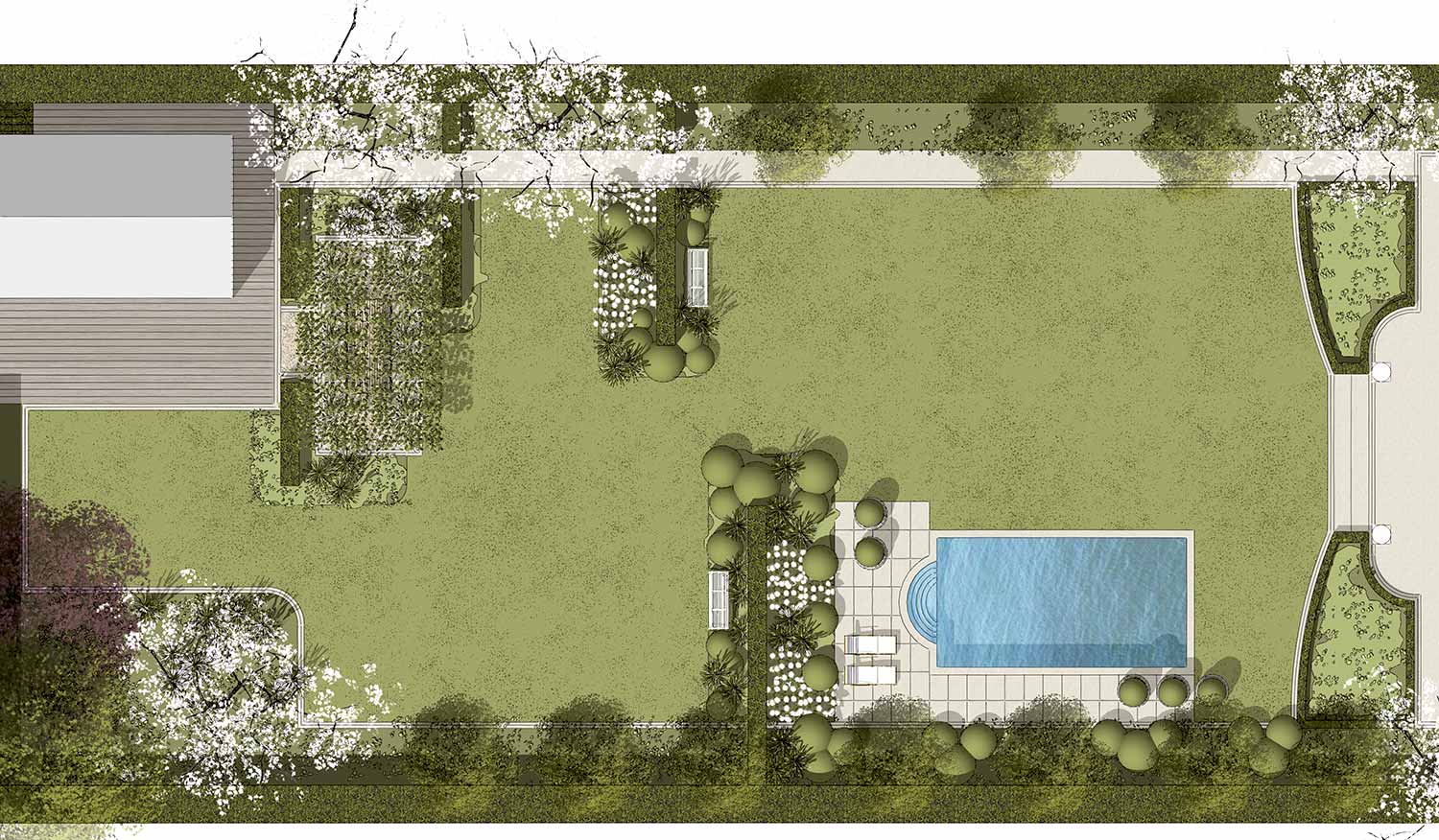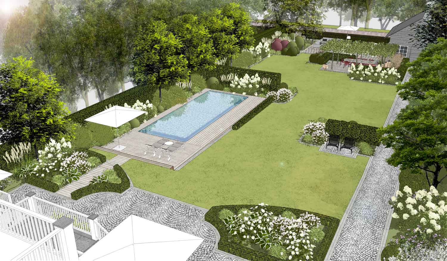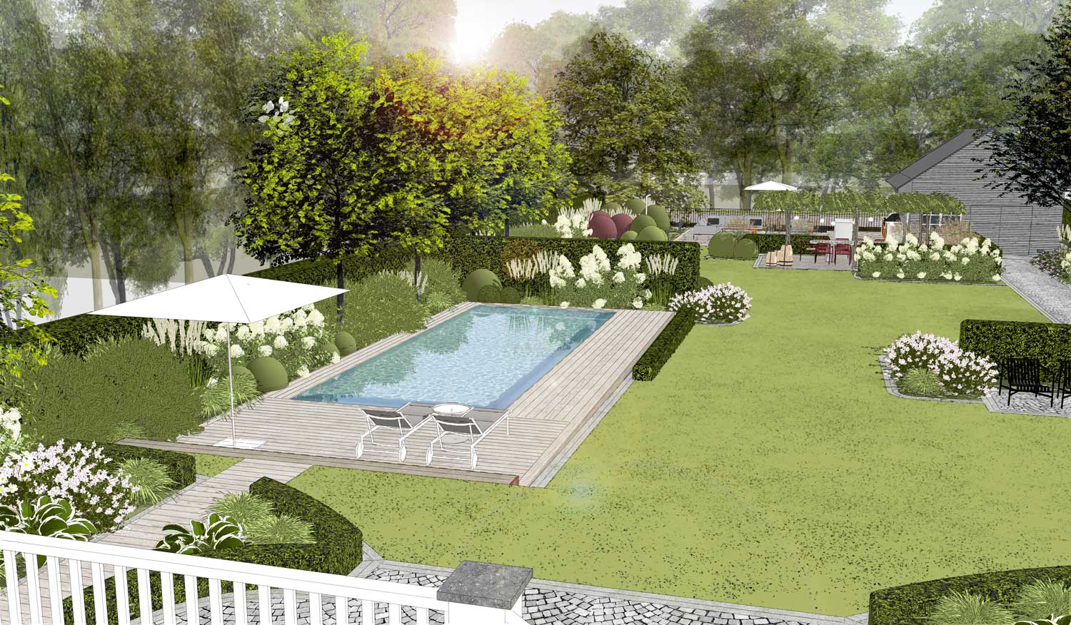 Wir wünschen uns einen klar strukturierten Garten, der zeitlos ist und einen hohen Komfort für uns als Familie bietet. Die Gestaltung soll ruhig und harmonisch sein, der Garten soll in erster Linie grün und weiß bepflanzt sein, die Pflanzen dürfen sowohl Struktur geben als auch blühend sein. Wir träumen von einem großen Pool und einem gemütlichen Aufenthaltsbereich am Wasser, in Verbindung mit einem großzügigen Essplatz für schöne Stunden mit Familie und Freunden.