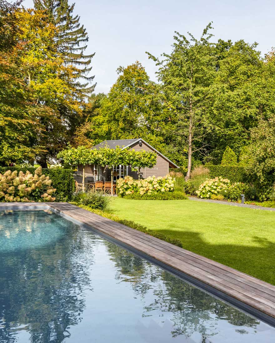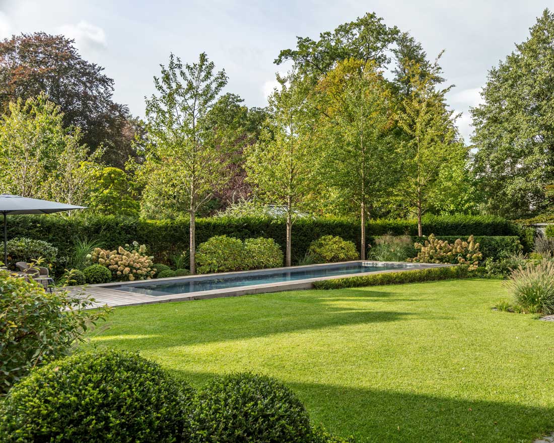 Die Gestaltung lebt von einer ruhigen Formensprache mit wenigen ausgesuchten Materialien, wie Holz für das Pooldeck und den Sitzplatz am Wasser, Kleinpflaster für Wege und Einfassungen und eine Kiesfläche für den Essbereich. Der großzügige Pool fügt sich harmonisch in die umliegende Bepflanzung ein und ist das zentrale gestalterische sowie funktionale Element. Die Planung und Umsetzung des Pools wurde in enger Zusammenarbeit mit dem Fachbetrieb „Poolkind“ in Bargteheide realisiert. Der Essbereich wird zum Treffpunkt des Gartens, ein Platanendach spendet lichten Schatten. Wie gewünscht, ist dieser Platz direkt mit dem Sitzbereich am Wasser verbunden und wird zum kommunikativen Treffpunkt.