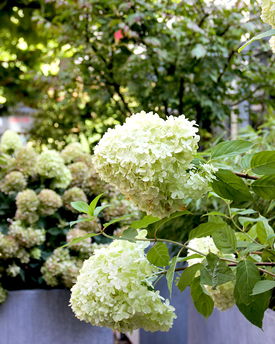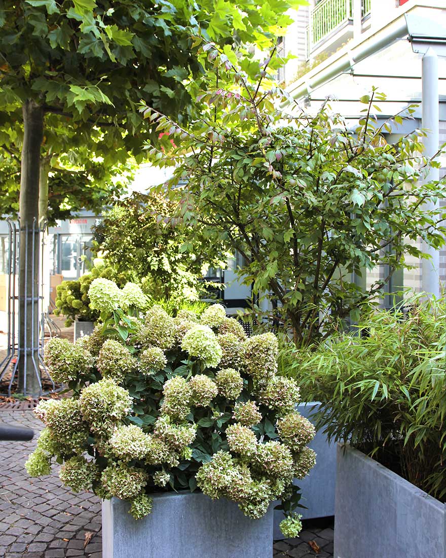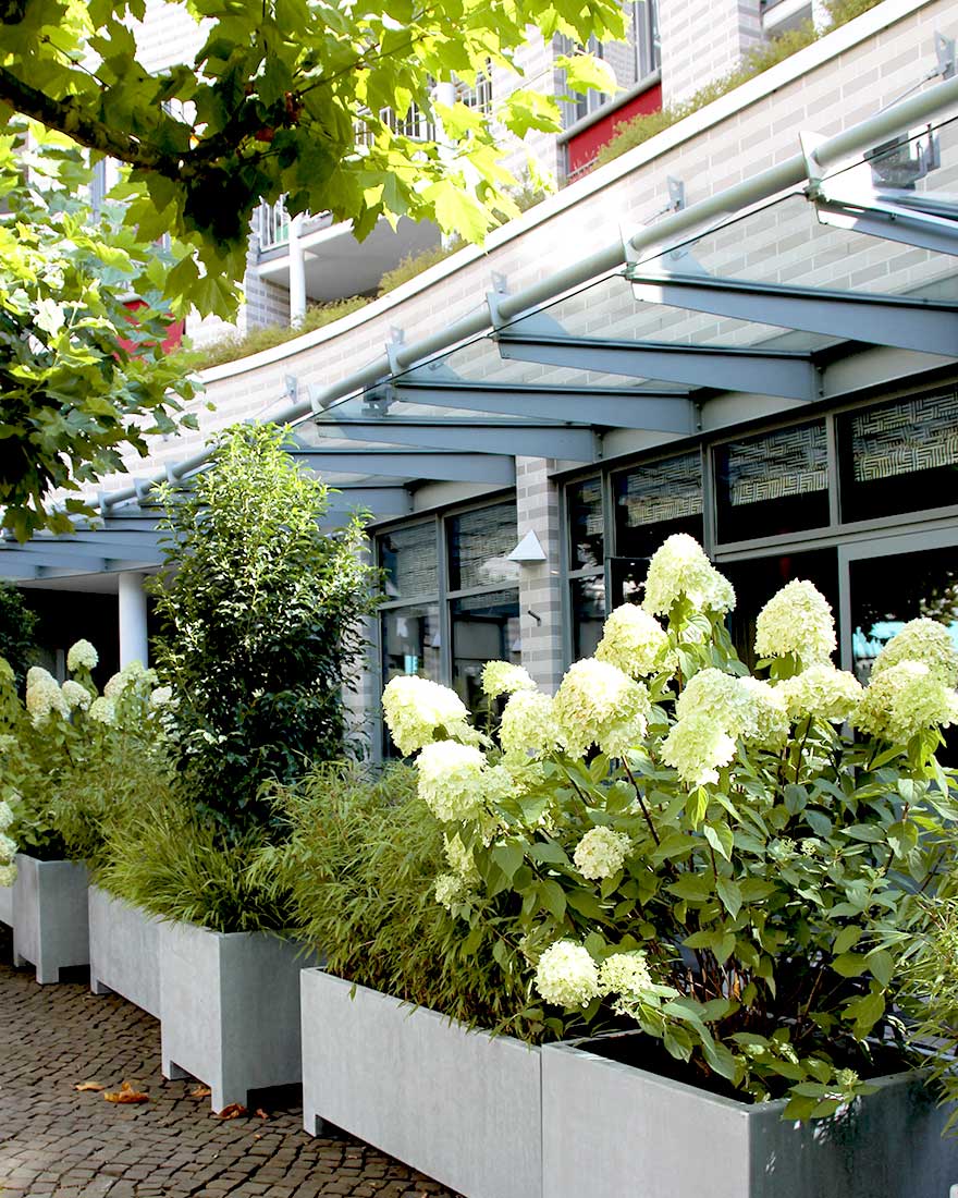Schon beim Ankommen werden die Besucher durch das grüne Entrée einladend empfangen. Im Zentrum der Gestaltung stehen Rispenhortensien, deren Blüten im Laufe des Jahres ein wechselndes Farbspiel zeigen. Ihre lange Blütenzeit machen sie zum Herzstück der Bepflanzung. Ergänzt werden sie durch schirmförmige Gehölze, mit ihrer spektakulären Blattfärbung im Herbst.